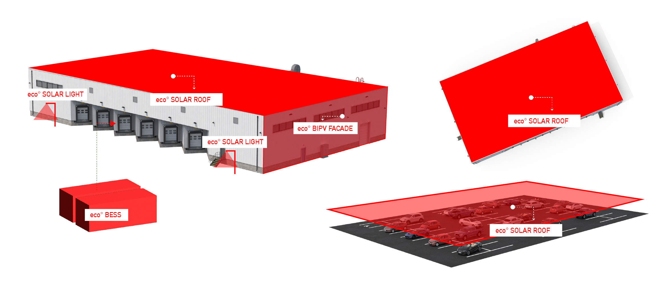 Applicable solutions include: solar BIPV for rooftop and façade integration, solar parks for ground and car park installations, BESS (Battery Energy Storage Systems) for storing and redistributing energy, solar lighting for driveways and loading bays