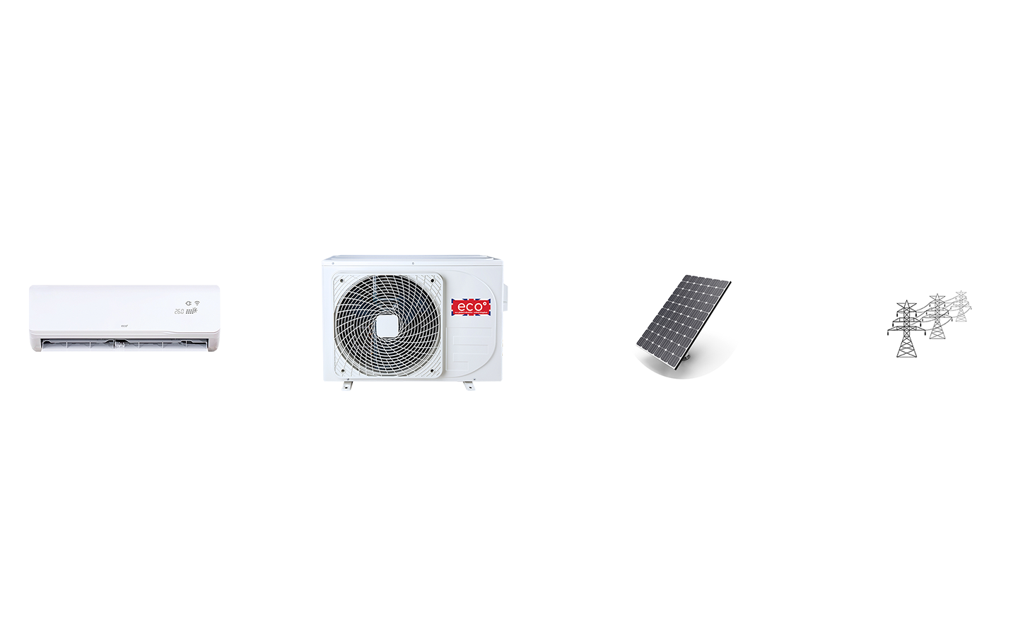 eco° HYBRID SOLAR air conditioner operates with an advanced configuration that eliminates the necessity for batteries or solar inverters.
